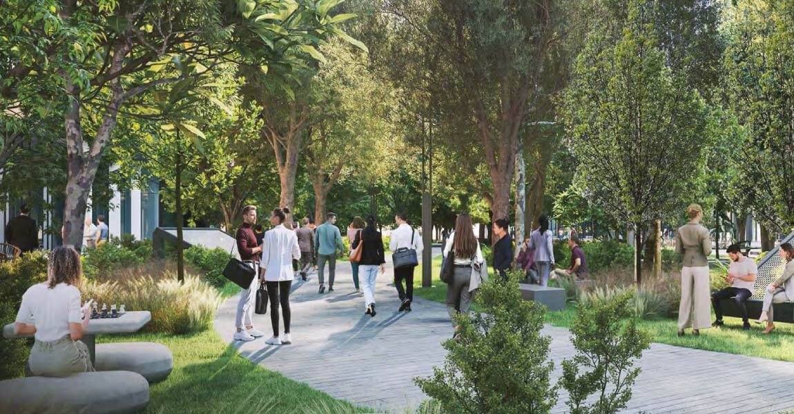 - Signature Green Spine – Forest park with walkways, art, and wellness spaces