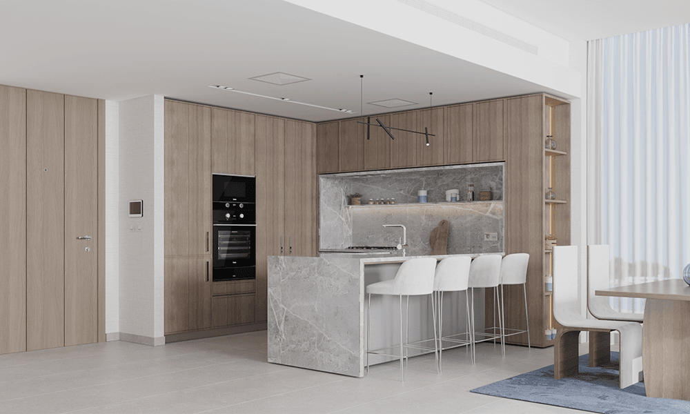 Every detail at Art Bay Ellington Al Jaddaf reflects refined craftsmanship and modern sustainability. The building features stone facades and wooden shading to ensure energy efficiency while maintaining an elegant design. Interiors are thoughtfully finished with porcelain ceramic tiles and granite-marble surfaces, creating a timeless and luxurious ambiance.