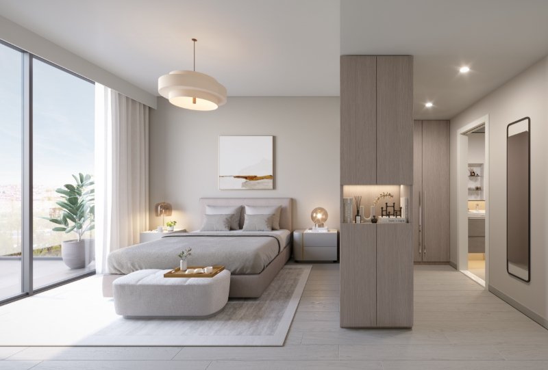 The development features studios, 1 and 2-bedroom apartments, elegantly designed with light-toned finishes, large panoramic windows, and open balconies overlooking lush green parks. Interiors are enhanced with modern kitchens that include stylish islands and built-in cabinetry, creating a bright and cozy atmosphere.
